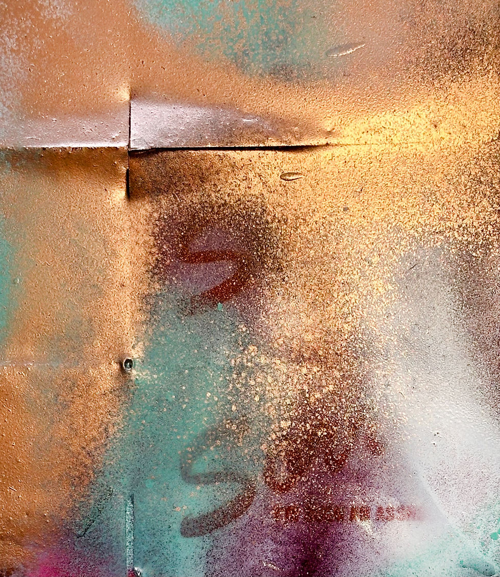 Free-spirited explosions of color are scribble-scrabbled in frenetic fits, using old paintings as a jumping off place. Spray paint is layered over intricate textures and finished with melted wax to level these pieces from chaos to beauty. Inspired by the vibrant comeback energy of Most are titled after streets in New Orleans, inspired by the vibrant comeback energy of that great city.